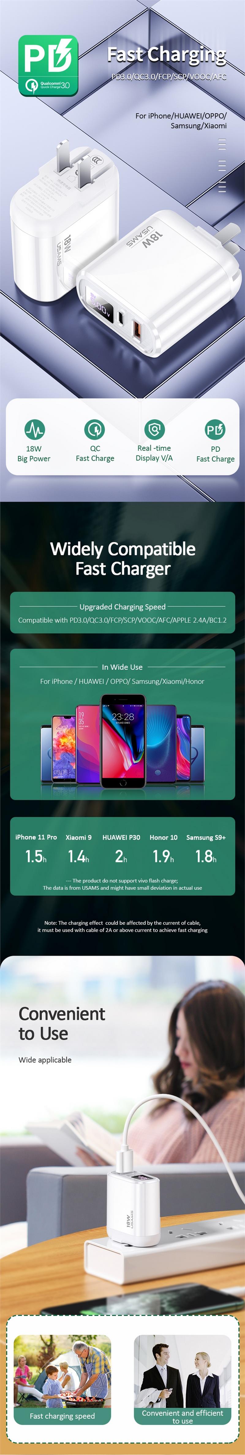 USAMS T30 18W QC3.0 PD3.0 Digital Display Fast Travel USB Charger for Samsung S10 for iPhone 11 Pro Max Huawei LG