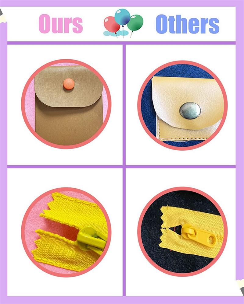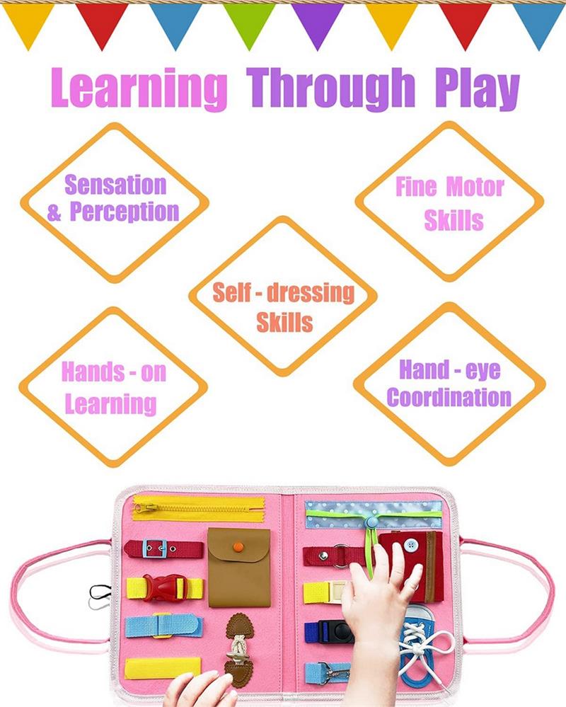 Great Sensory Toys:Busy boards for toddlers can develop kids’ fine motor skills and basic life skills through play. It’s a fun and effective learning toy to help young children learn to dress.