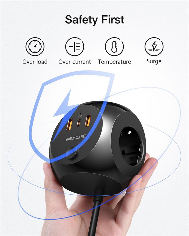 BlitzWolf BW-PC1 2500W Power Strip Socket USB Charger With 3 * AC Outlets /20W USB-C PD/ 18W 2 * USB-A QC3.0 Fast Charging For iPhone 13 13 Pro Max 13 Mini For OnePlus 9Pro For Xiaomi MI10