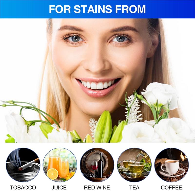 High-quality whitening formula and dental care, for the discoloration of teeth caused by long-term smoking, drinking coffee, etc., and the discoloration of teeth caused by drugs. Removes stains from coffee, tea, red wine, juice, cola, etc. Make your teeth brighter and whiter than ever.