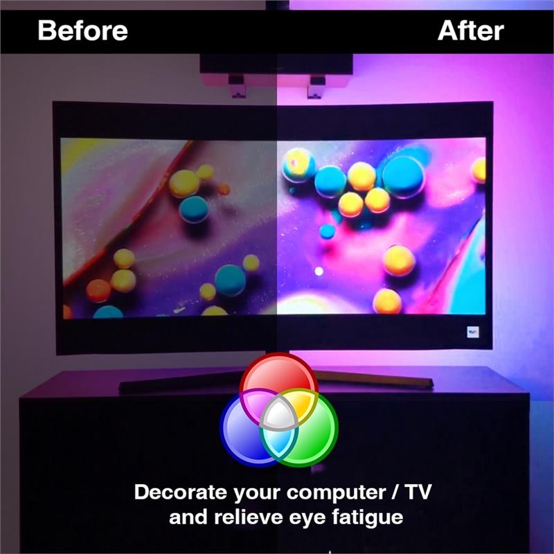 4. Applications:for televisions, computer monitors, cabinets, kitchens, stairs, corners and reading rooms. Suitable for home decoration purposes, backlight, hidden lighting, advertising signs lighting, decorative lights holiday, activities, exhibitions. Suitable for car and bicycle decoration, shelf lighting, mirror backlight and festive lighting. Border or outline.