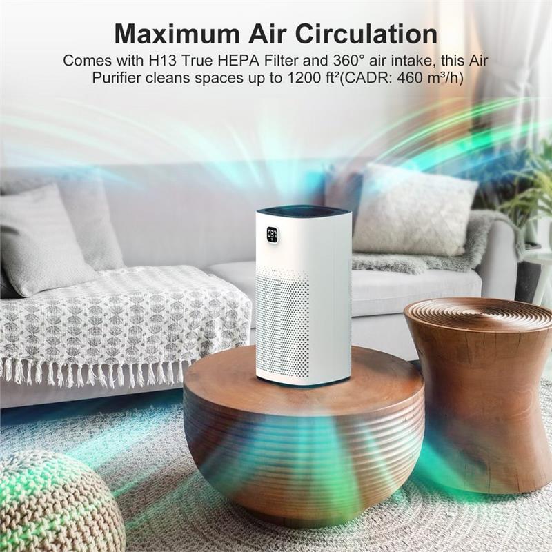 ??HIGH PERFORMANCE??Comes with H13 True HEPA Filter and 360?? air intake, this Air Purifier cleans spaces up to 1200 ft2(CADR:460 m3/h).