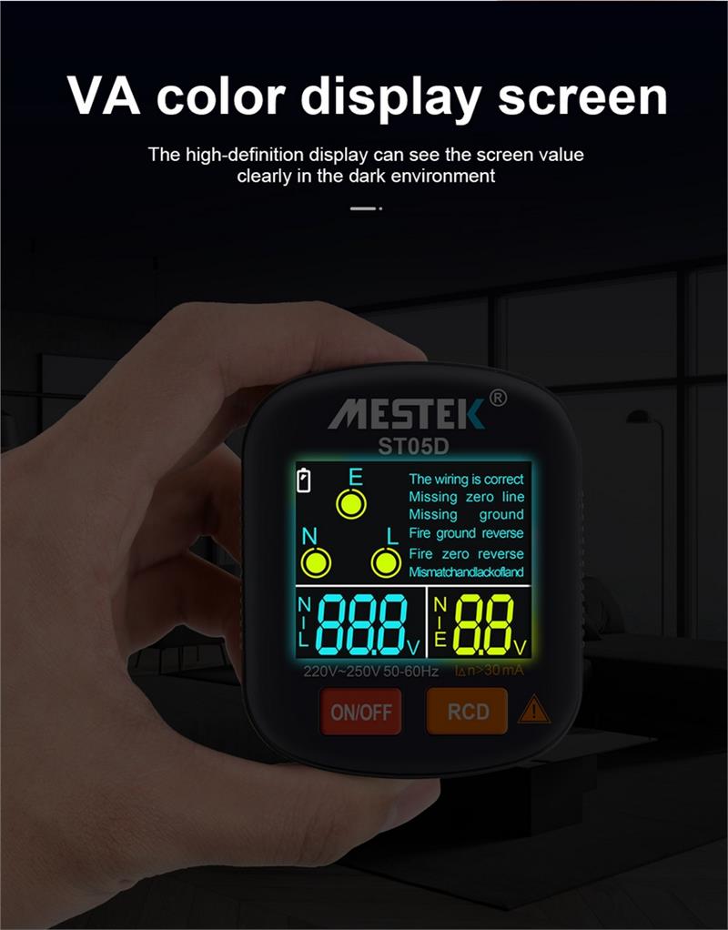 MESTEK Socket Tester Detector wiring Electroscope Electric Plug Color Screen RCD Safety test Electric Tester Home Socket Tester