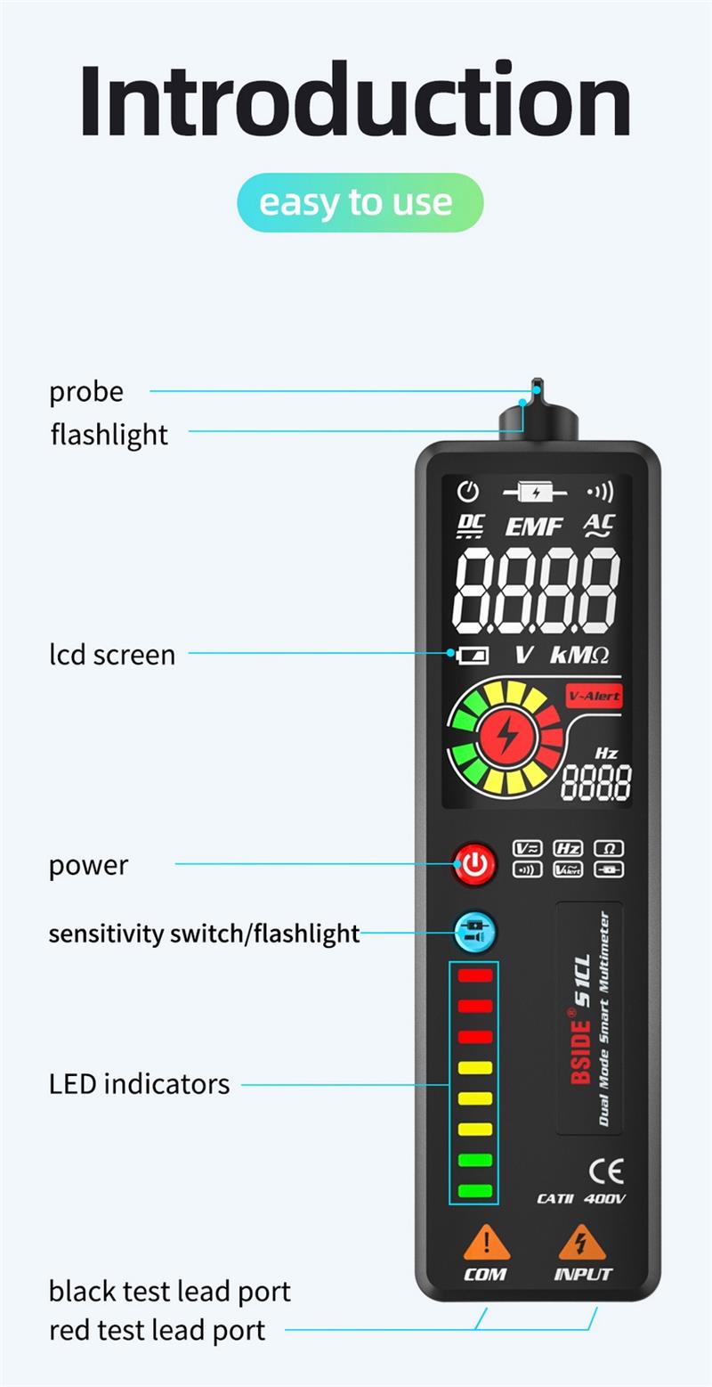 [Automatic Identification]:Automatic identification greatly improves your test efficiency. BSIDE smart technology make this multimeter can automatically identifies the tested parameters and choose their required range.