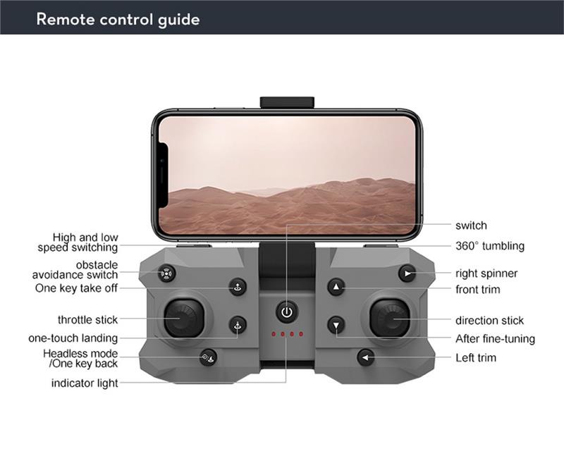 Function:up / down, front / back, left / right turn, lateral flight, three-level flight speed, around flight, waypoint flight, altitude hold mode, headless mode, one key return, one key take off and landing, WiFi FPV, dual camera / video, Infrared Obstacle Avoidance