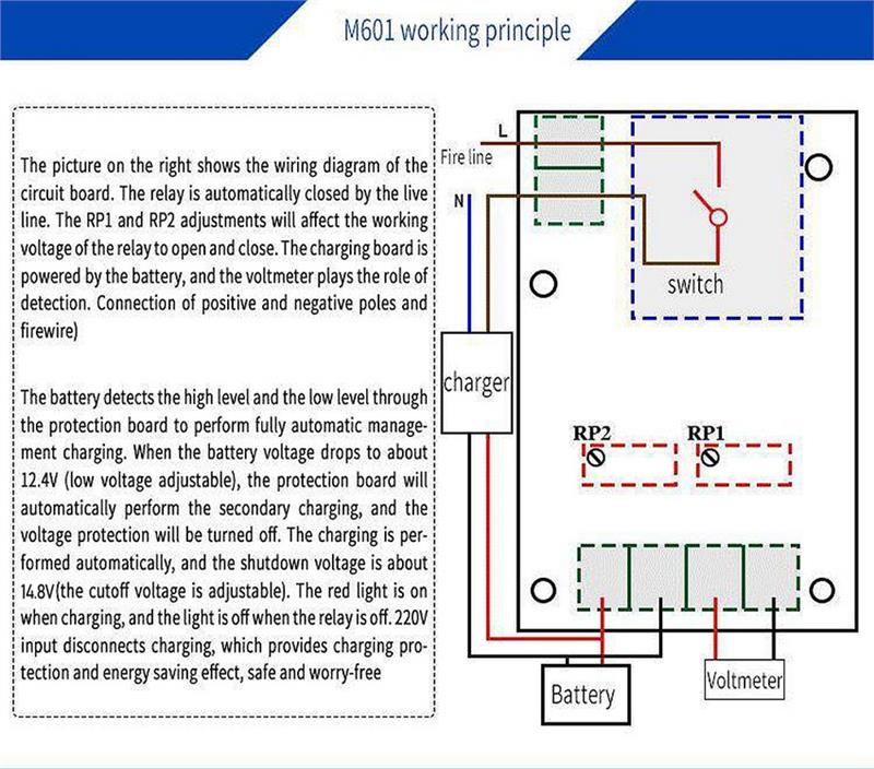 1. This board is specially designed for:12V battery, when the battery voltage drops to about 12.4V (low voltage adjustable), the protection board will automatically perform secondary charging, and when the power is turned off about 14.8V (M (cut-off voltage adjustable). Charging When the red light is on, the red light is off when fully charged, and the relay disconnects the 220V terminal to end the charging, thus achieving the effect of energy saving.