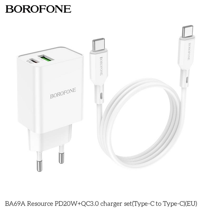 BOROFONE BA69A Resource PD 20W + QC 3.0 Dual Ports Type-C + USB-A Port EU Wall Charger Adapter with 1m Long Type-C to Type-C Cable For Samsung Galaxy S22 Ultra Galaxy Z Flip 4 For Xiaomi Mi 12T Redmi Note 12 Huawei P50