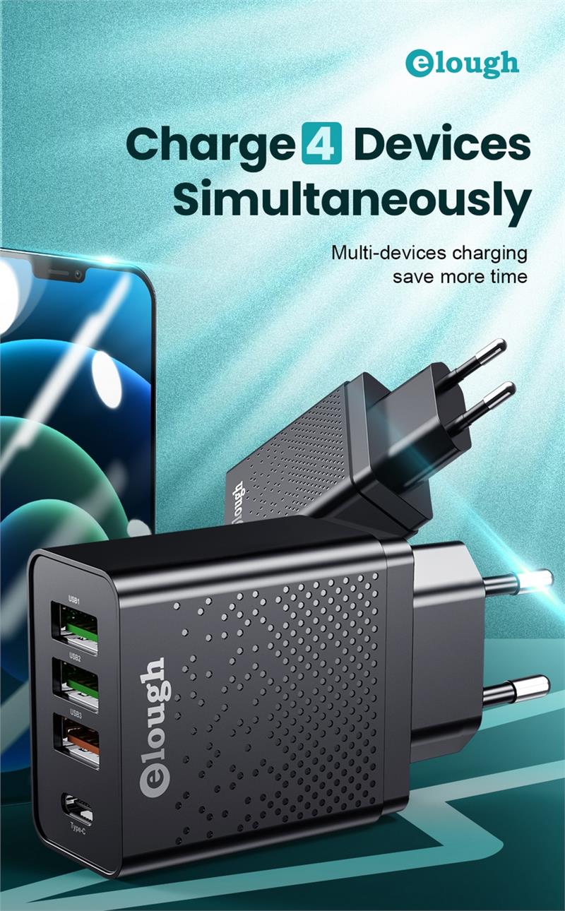 Elough 20W 4-Port USB PD Charger 3USB+Type-C QC3.0 PD4.0 Fast Charging Wall Charger Adapter EU Plug for iPhone 12 13 14 14Pro 14 Pro Max for Huawei P50 for Samsung Galaxy S22 for Oppo Reno9 for Redmi K60