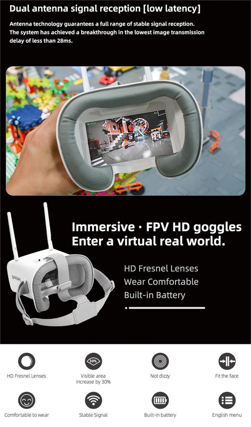 | QG2 5.8G FPV goggles | Operating Frequency Band:5.8G Channel:40CH(default 4CH, 40CH available after unlocking) DVR Recording:Yes Screen Size:4.3 Inch Resolution:800×480 Display Ratio:16:9 Battery:Li-ion polymer Color:White |