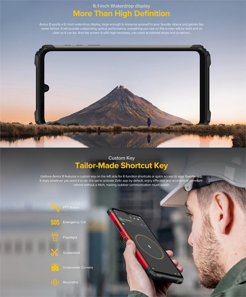 | Packing List | 1 x Ulefone Armor 8 Smartphone 1 x Data Cable (100cm) 1 x Tempered Glass Screen Protector 1 x Sling 1 x SIM card needle 1 x EU Charger |