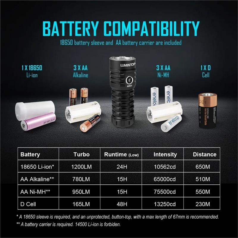 Lumintop AD01 650M 1200 Lumen Flashlight Outdoor IPX8 Waterproof High Powerful Lighting Portable Mini Torch Power by 18650/D/3xAA Battery Night Reading Emergency Light