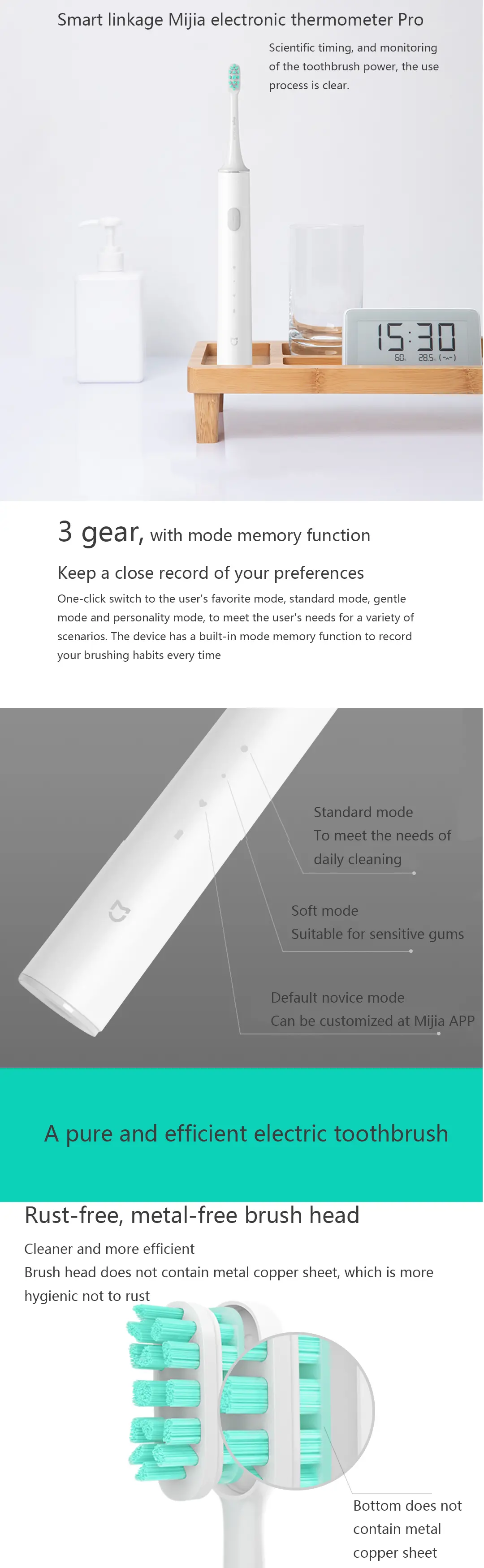 | Main Features: High-frequency vibration magnetic suspension motor, cleaning the teeth without leaving a blind spot Intelligent over-pressure reminder to avoid excessive force and damage to the gums Personalized custom tooth cleaning mode to meet a variety of oral needs Rust-free and metal-free brush head, clean and efficient APP intimate butler, comprehensive care of oral problems, intelligent identification of dental teeth, oral report teaches you to brush your teeth correctly Intelligent linkage with Mijia Electronic Thermometer Pro, counts down the time of brushing teeth synchronously, even the brushing time in each area of the mouth, scientific timing, and monitoring the power of brushing teeth at the same time, so that the use process is clear at a glance |