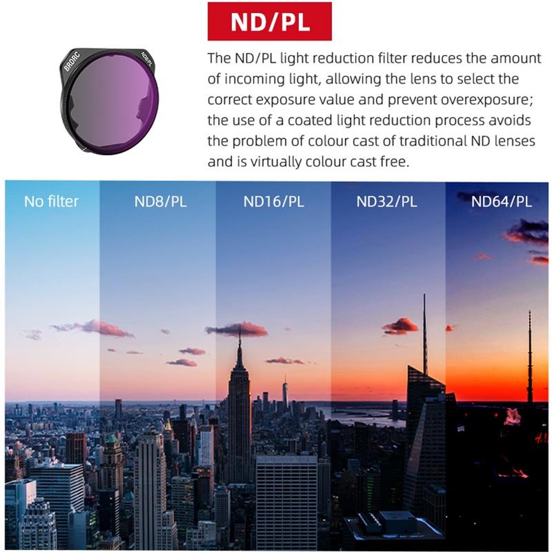 – Optical glass, precision grinding and polishing, high-definition imaging;- Using multi-layer nano-coating technology, endow the lens with high-quality waterproof, oil-proof, anti-fouling and scratch-resistant performance;- Aviation aluminum frame material, light weight does not affect the work and self-inspection of the gimbal, laser laser LOGO, no fading and no rust;- CPL/ND PL can be adjusted, the light can be adjusted by rotating the gear, and the appropriate brightness can be selected for shooting.