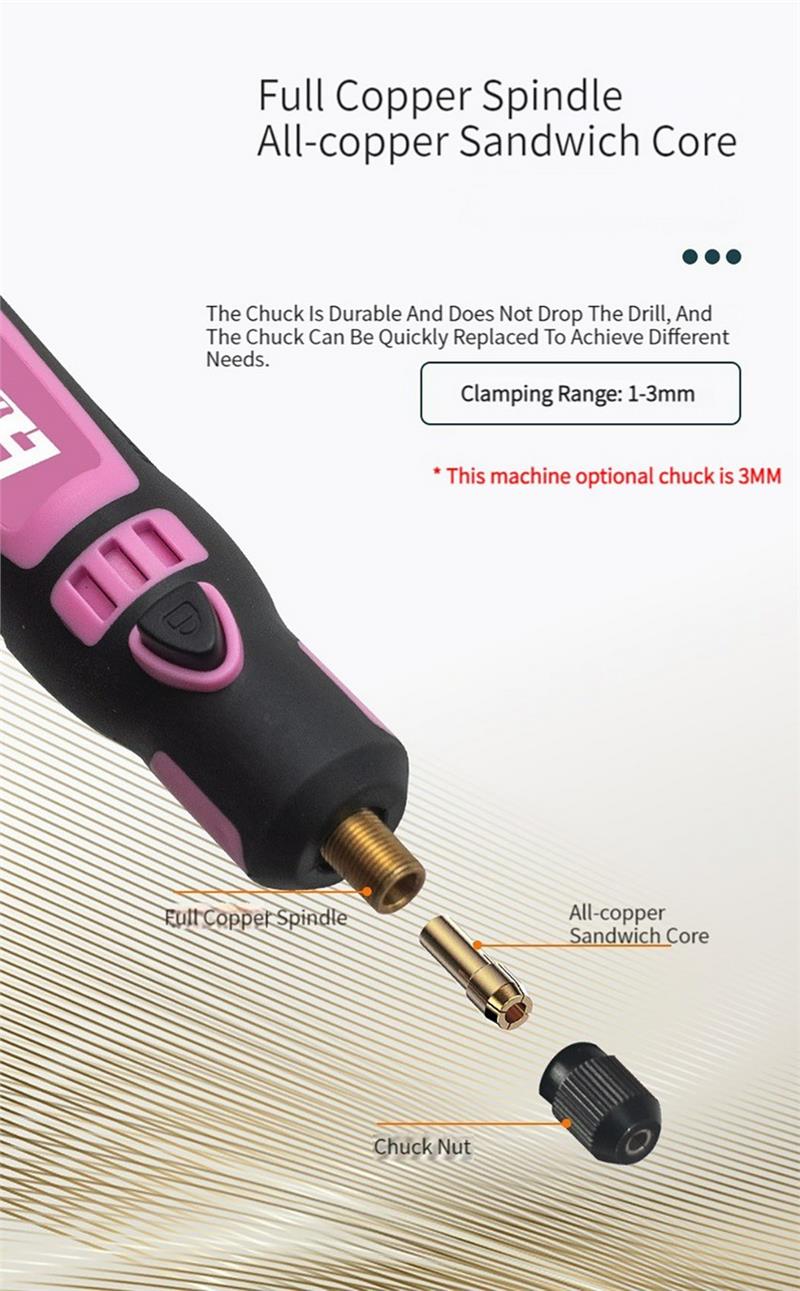 – Wide Clamping Range:With a clamping range of 1-3mm and a 3mm chuck, this tool can handle a variety of bits and accessories.