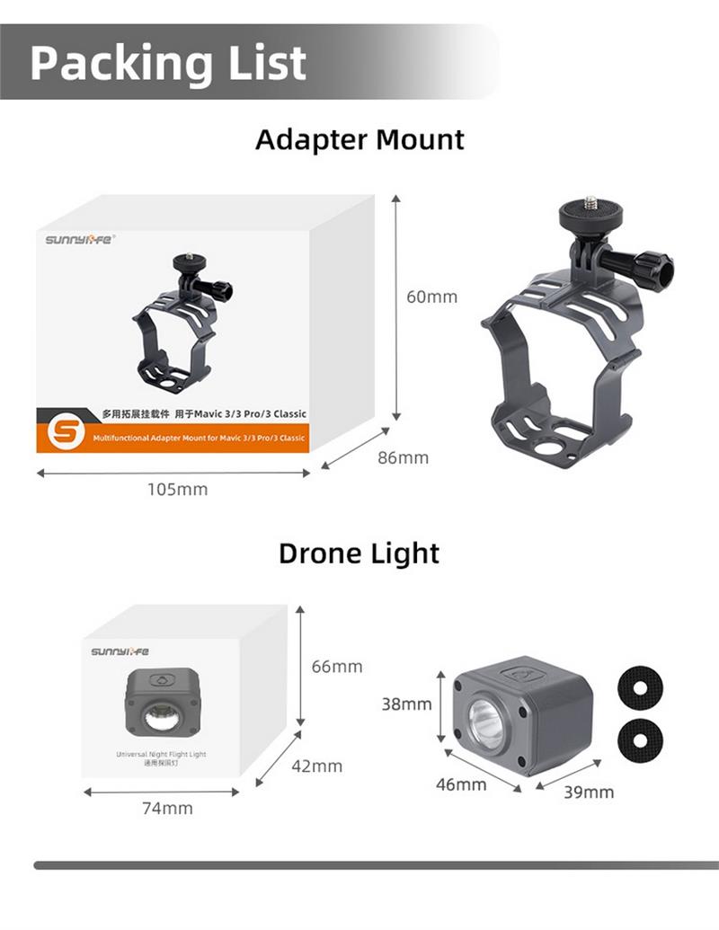 Specifications:Brand Name:SunnylifeItem Name:Expansion Multifunctional BracketItem NO.:GZ580Material:PlasticColor:GreyAdjustable Range:128-225mmNet Weight:30gQuantity:1PCPackage Weight:68gPackage Size:105x86x60mmUsage:for DJI Mavic 3 Pro / Mavic 3 Classic / Mavic 3 RC Drone QuadcopterFeatures:- Multi-purpose expansion mounts:standard action camera adapters can mount Action 3, Action 2, GoPro8/9/10/MAX, Insta360 One R and other action cameras; 1/4 adapters are included for direct installation of Insta360 X2/ X3, searchlight and other equipment.- One-piece molding, stable installation:It is integrated with the fuselage, and will not block the drone’s fill light and downward-looking sensor.- Can be used with Sunnylife searchlight.Note:Package Only 1PC Bracket. The Drones and Camera in pictures only for display, NOT Included!Package Included:1 x Camera Mount Bracket