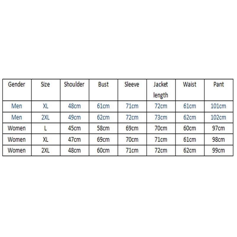 | Gender | Size | Shoulder | Bust | Sleeve | Jacket Length | Waist | Pant |